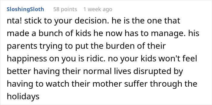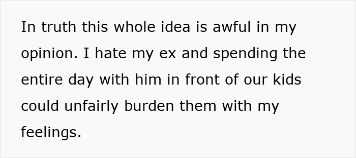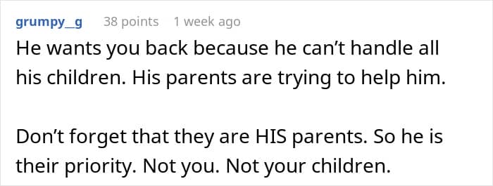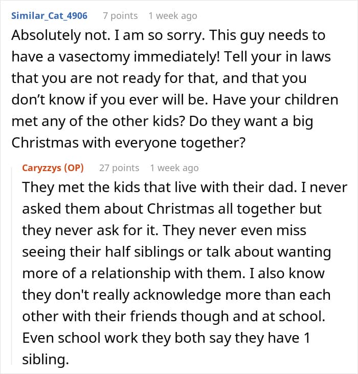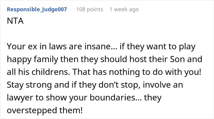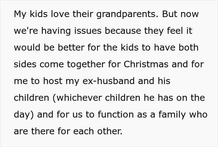 But the problem is, the original poster doesn’t want that at all! She believes that tension between her and her ex-husband shouldn’t spoil the holiday atmosphere and that his kids have no business being in her house. She’s mentioned this to her ex-in-laws several times, but they’ve only gotten upset and continued to insist. So she decided to take it online, seeking support and advice.