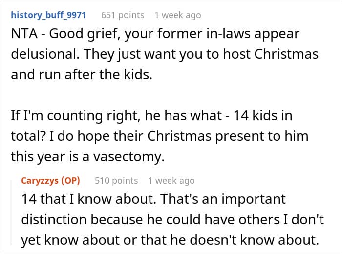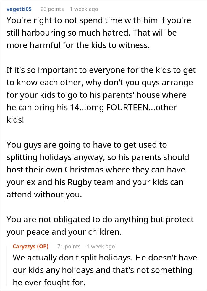 Most commenters, of course, sided with the OP, arguing that she’s under no obligation to host Xmas for a man she still dislikes. And if the guy’s parents want a family atmosphere for the holiday, then let them host the event themselves and not demand another person do it. “You are not obligated to do anything but protect your peace and your children,” one of the responders wisely wrote. So, isn’t that right, our dear readers?