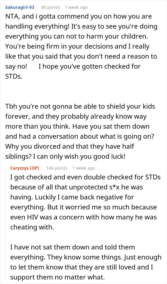 So, the Original Poster (OP) says that she and her husband have been divorced for over five years, and their children (now 11 and 9) live with their mother, while the dad appears in their lives about once a month. This, apparently, suits him just fine. Especially since he currently has many other problems. The thing is, both during their marriage and later, he never restrained his love for other ladies.