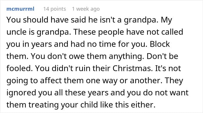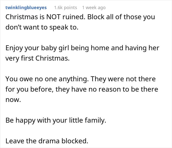 That’s when all hell broke loose as she started receiving calls and messages from all the toxic folks. Sadly, the poster was already struggling with postpartum depression when she had to deal with their criticism. Not only did they all accuse her of ruining her father’s Christmas, but they also called her “heartless, selfish, and inconsiderate,” among other things.