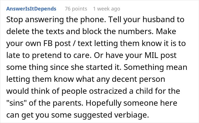 As if her absent father had not caused her enough trouble, she also had to face harsh treatment from his relatives. It’s only natural that she would want to shield positive things from such negative people. Folks advised her to share how she feels with her husband and block all the toxic people. Her and her baby’s health matter most, so I agree with the Redditors.