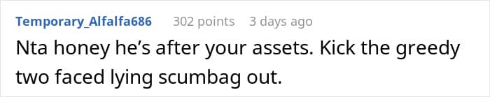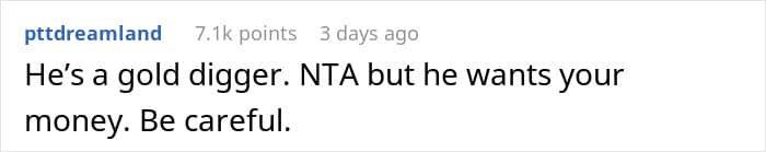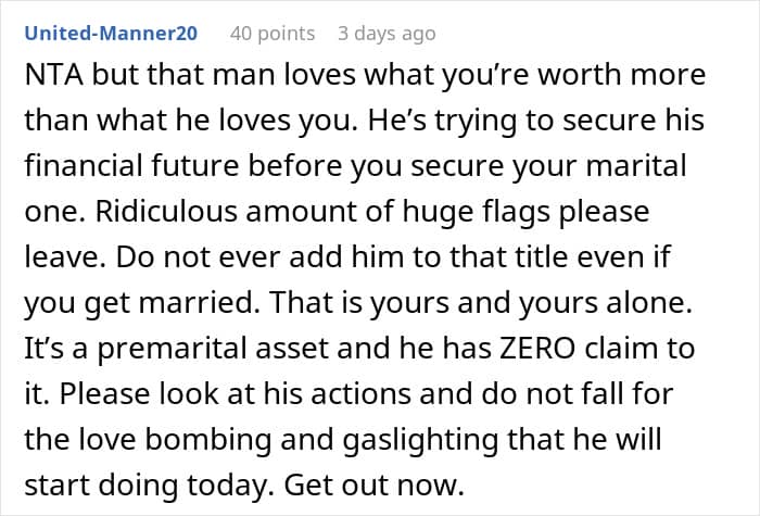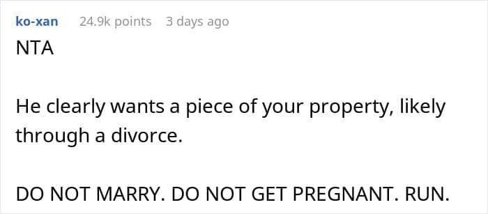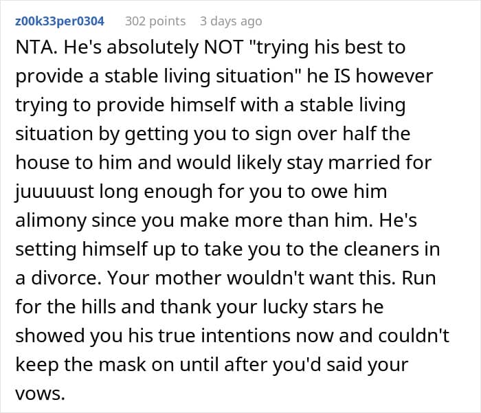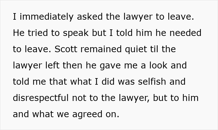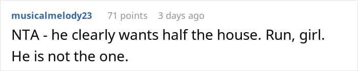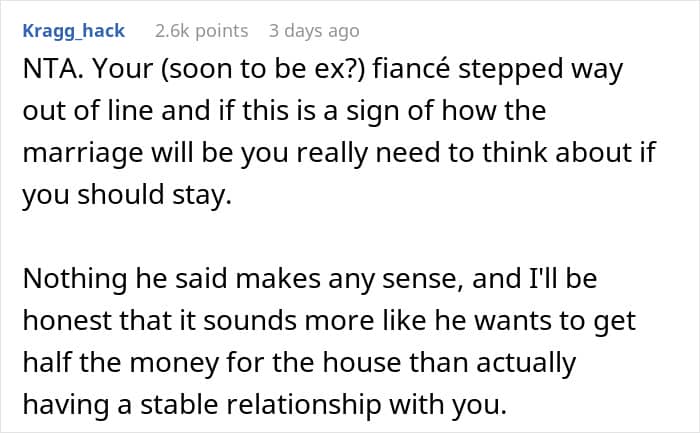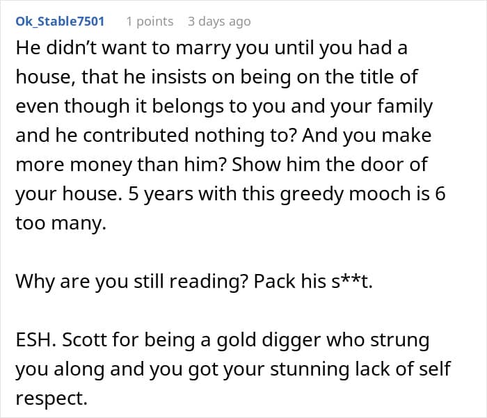 This is something many commenters point out, that she isn’t wrong, but she needs to get a bit of self respect and put her foot down. This man is being ridiculous, more so that he has suddenly gotten offended because she won’t give him a share of a house. This reaction should have been the final indication that Scott’s relationship calculus has shifted and that he does not have his priorities right.