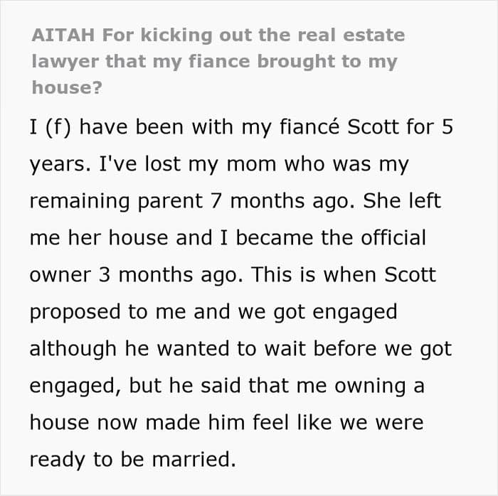 But one woman was unpleasantly surprised when her fiancé suddenly brought in a lawyer after she inherited a house