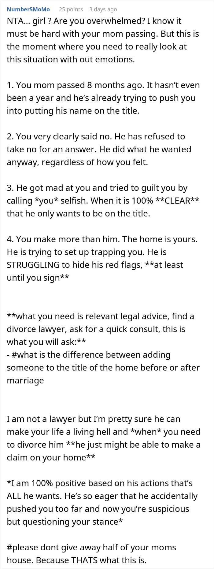 A woman wondered if she was wrong to snap when her fiancé brought in a real estate lawyer with the intention of adding his name to the title of a house she just inherited. Netizens gave her some advice, ranging from supportive messages to some gentle reminders to be more careful about who you are planning to marry.