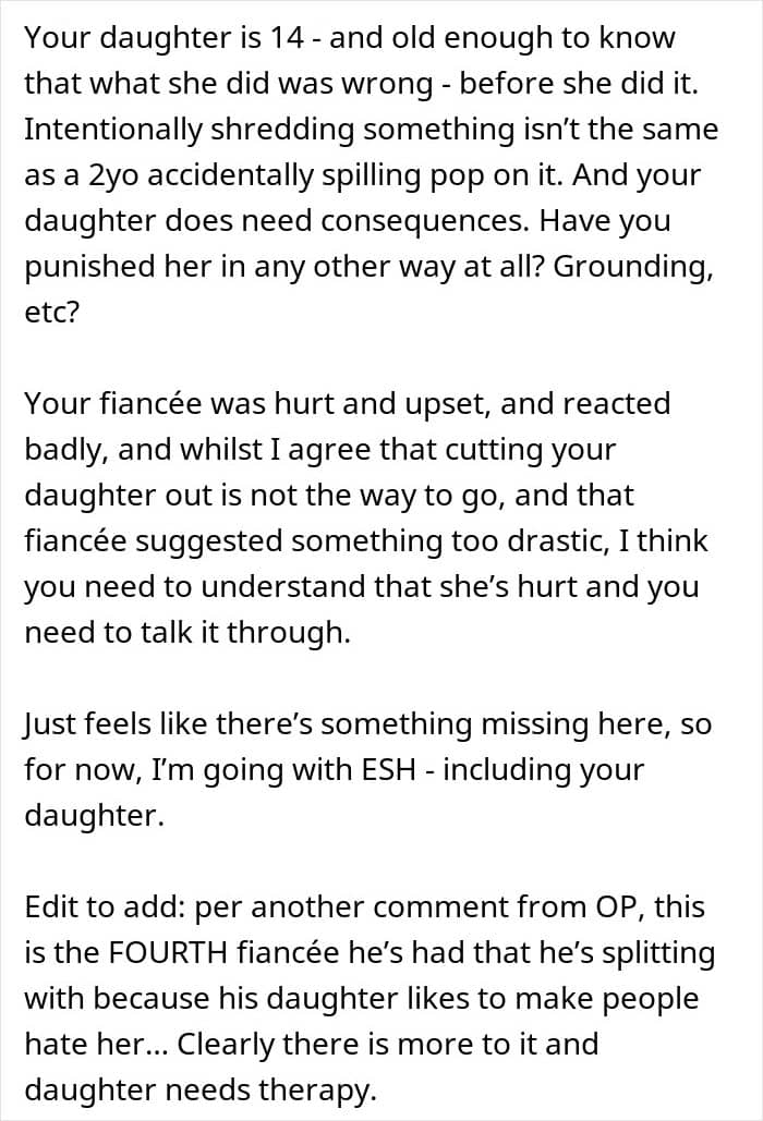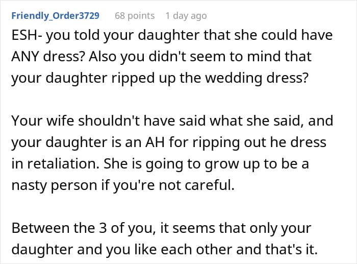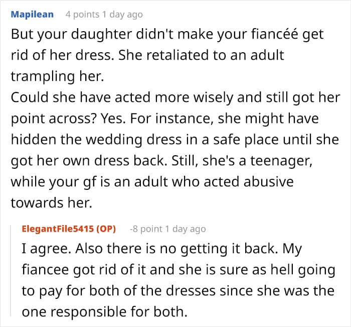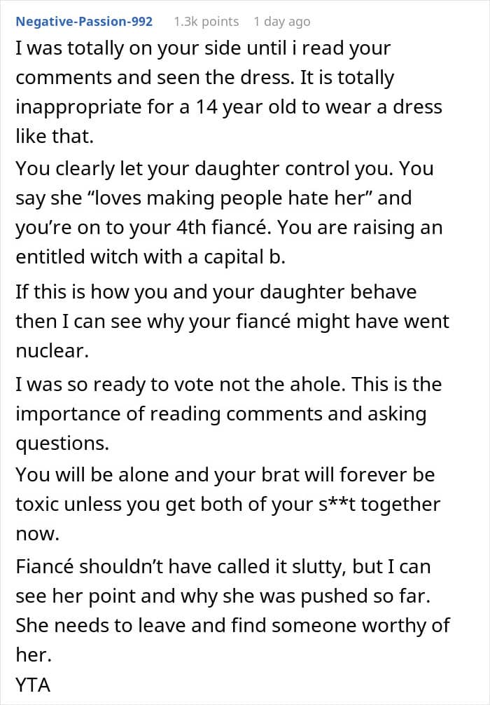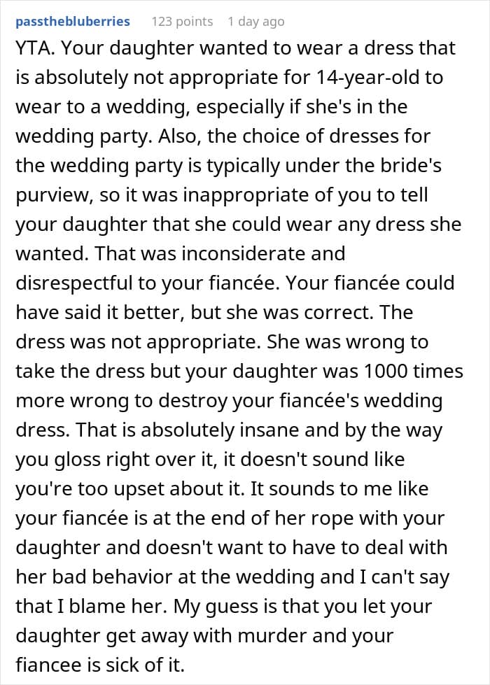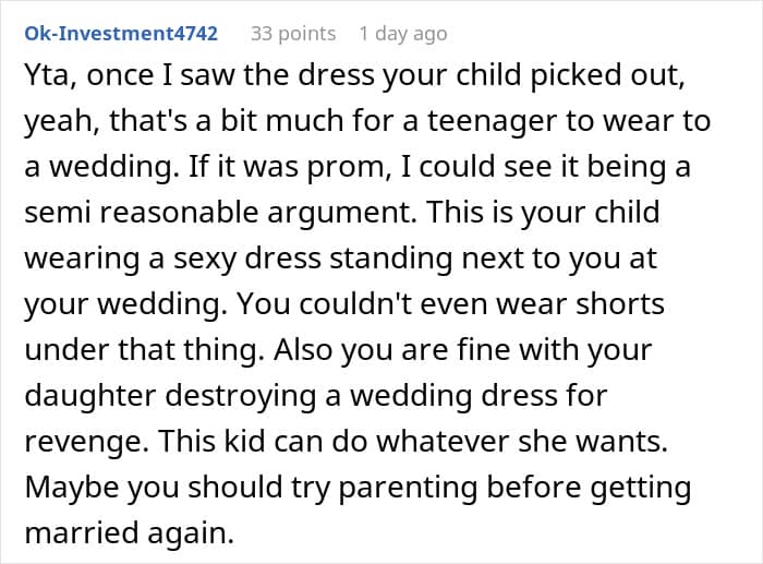 But when one woman decided that the dress her fiancé’s daughter chose to wear to their wedding was inappropriate, the teen decided that neither of them could have their dream dress. Below, you’ll find a story that a concerned parent recently shared on the “Am I the [Jerk]?” subreddit wondering if they should call off their wedding altogether due to this dress drama, as well as a conversation with Ginger Ogle, Founder and Director of the Berkeley Parents Network.