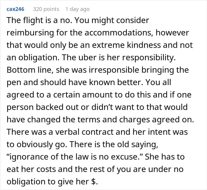 When the group decided to proceed as planned, the woman wanted them to pay back her expenses