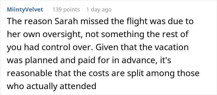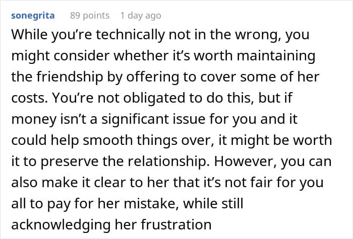The author did explain that they are on a tight budget because of recurring bills, and paying for their friend’s missed vacation may put them a month behind their payoff plan.