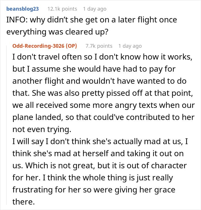 The woman became irate about her friends’ decision to go without her, even if her ill-advised choices caused her to miss the trip. She may have let her disappointment get to her, lashing out at everyone.