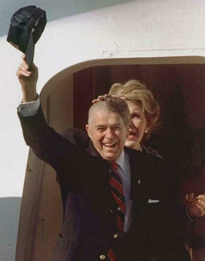 Ronald Reagan exposing his half-shaved head before the applause of well wishers who saw him off at the airport in Rochester, MN, Sept. 15th, 1989. The former POTUS had to have a blood build-up removed from between his skull and brain after having suffered a fall from his horse two months earlier.