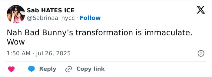 “Nah, Bad Bunny’s transformation is immaculate. Wow,” another chimed in.