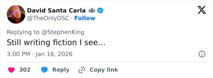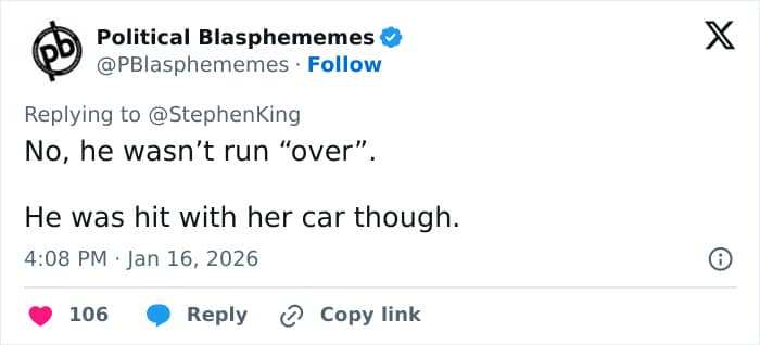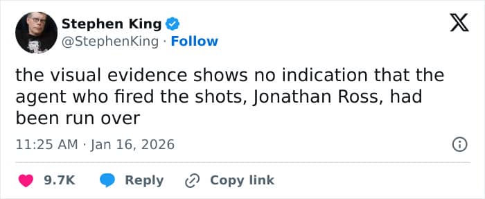 Author Stephen King is facing criticism over a social media post questioning the narrative that the ICE agent who fired at Renee Nicole Good was “run over” by her vehicle.