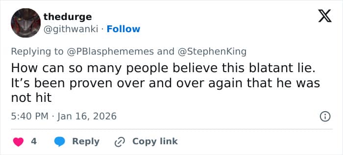 RELATED:HighlightsStephen King commented on the claims that ICE agent Jonathan Ross was “run over” during the incident with Renee Nicole Good.Public opinion remains divided, with some saying Ross was hit while others argue he didn’t act in self-defense.Ross reportedly suffered internal bleeding from the encounter; the FBI investigation is ongoing.Stephen King sparked backlash after commenting on the footage showing ICE agent Jonathan Ross and Renee Nicole Good