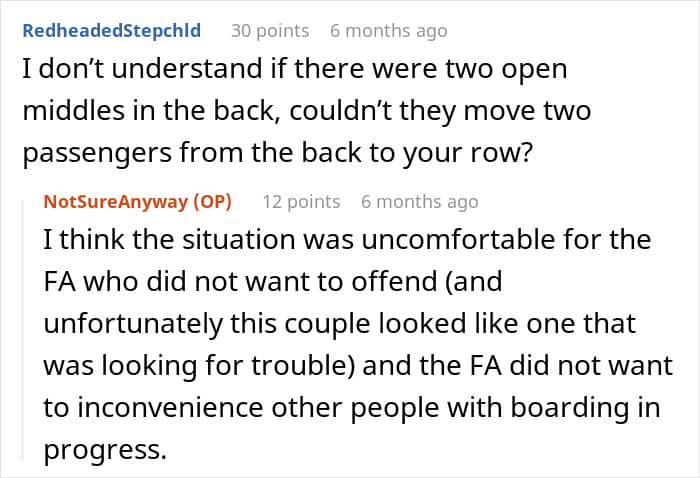 In the comments, readers praised the passenger for holding their ground, and one even offered a practical solution involving refunds or upgrades for being inconvenienced