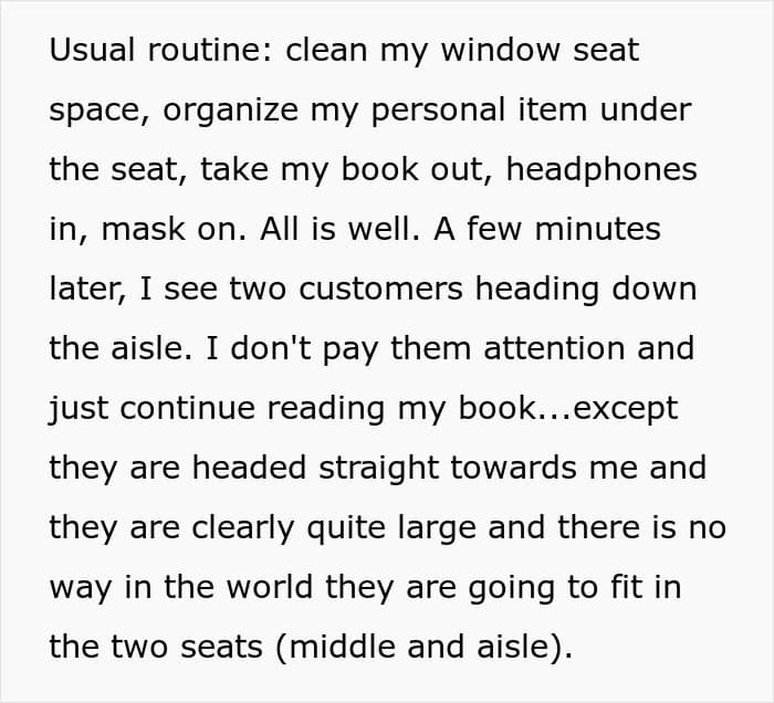 Flying can be stressful, but OP’s recent experience left them absolutely fuming. They boarded their United flight, got comfy in their window seat, headphones in, and book ready; everything seemed perfect. However, when a couple came down the aisle, it became obvious they weren’t going to fit in their two assigned seats, right next to OP’s.