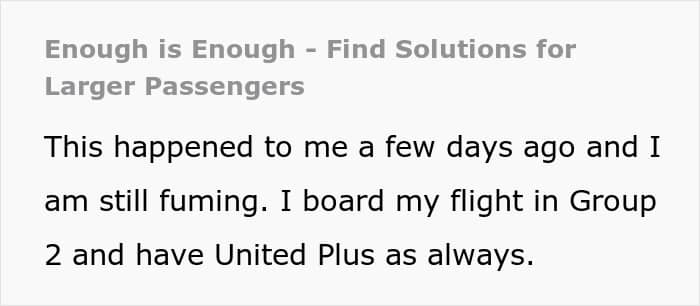 So, it seems some airlines are already tackling the “larger” passenger problem in an inclusive way, but not all of them, yet. Perhaps OP should take their complaint directly to United and, if they don’t get satisfaction, simply change airlines.