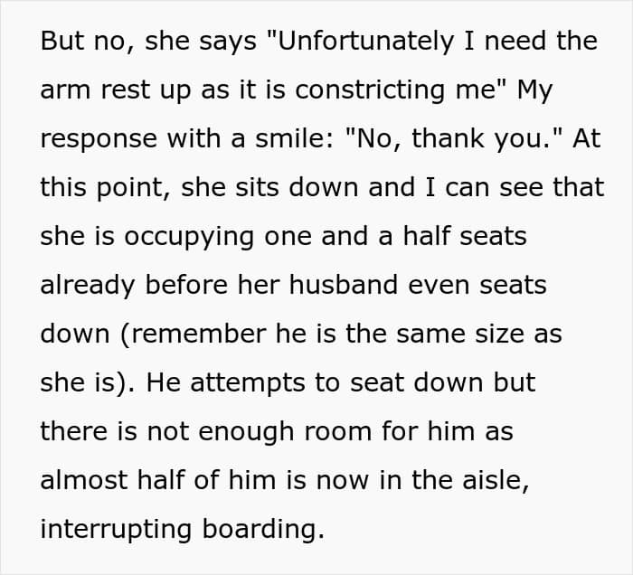 The couple squeezed in anyway, with the obese husband practically sitting in the aisle. The woman huffed, puffed, and even forcefully tried lifting the armrest herself. When that failed, she called the flight attendant, who calmly explained that no passenger is required to give up the space they paid for. Awkward.