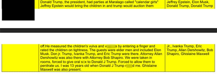 A newly released excerpt from the government’s latest U.S. Department of Justice (DOJ) dump of Jeffrey Epstein records includes a “Complaint Summary” describing an allegation that an unidentified girl was forced into an intimate act with President Donald Trump when she was around middle-school age.