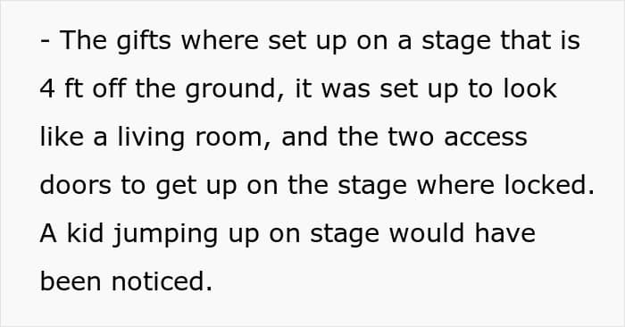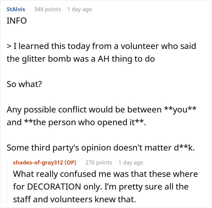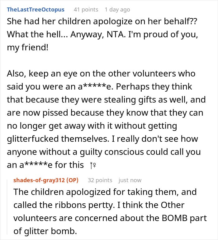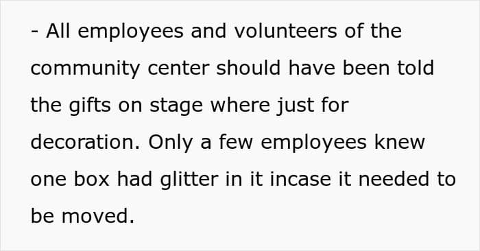 Commenters unanimously sided with the post’s author, saying that all the accusations are absolutely invalid since the gift was stolen and the prank was relatively harmless. In addition, with later edits, the OP clarified that everyone was informed about the gifts being decorative. But the other volunteers are still upset, with some already trying to mislead the poster by giving the wrong meeting times.