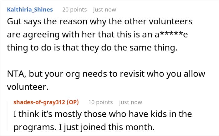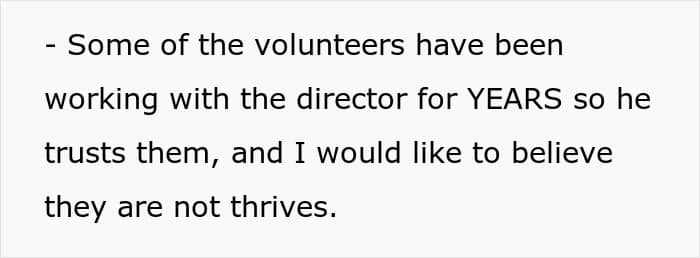 In addition to being told not to come back, the woman was laughed at by the OP and the director. However, the other volunteers saw it entirely differently and collectively declared that the author was a jerk for doing what they did.