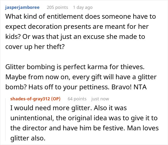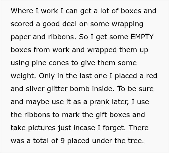 Usually, at least you know what you’re in for. This time, the person on the receiving end didn’t. One Redditor knew that decorative gifts on the display kept going missing, so they came up with a little trap to catch the thieves by slipping a glitter bomb into a fake “present.”