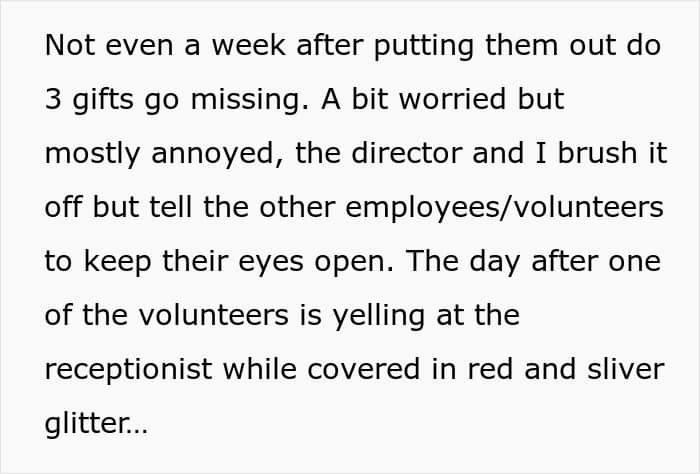 Another day went by, and one of the volunteers was already covered in glitter, arguing with the receptionist. She demanded compensation for cleaning their house and emotional distress as the gifts she thought she gave her children contained only yard trash and an unwelcomed surprise.