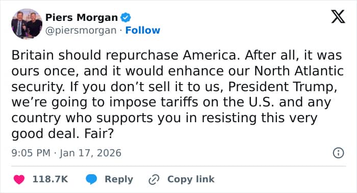 Others spoke about Morgan’s recent tweet, in which he suggested the American president should “sell” the US to the UK.
