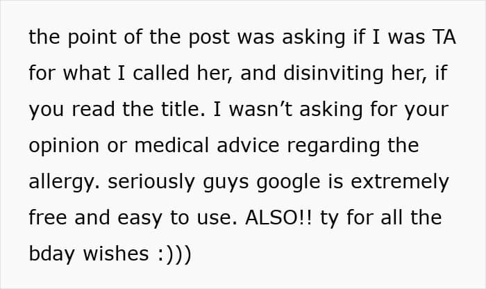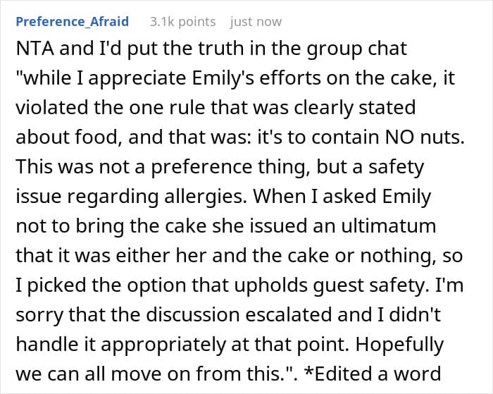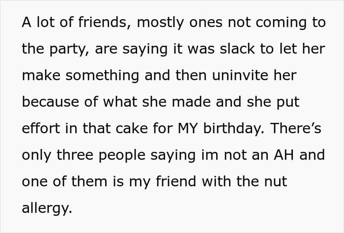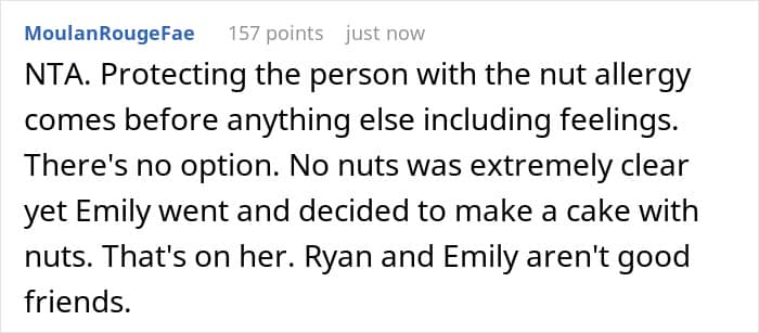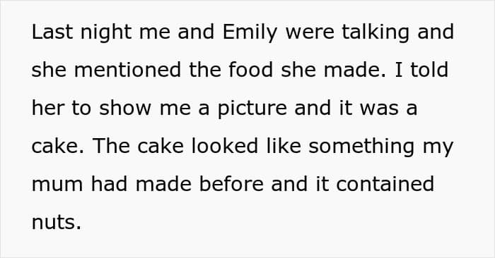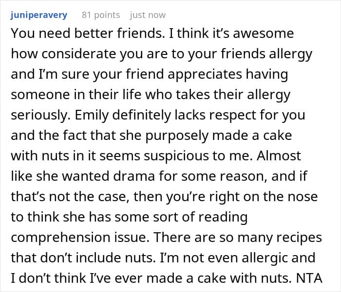 And so, literally the day before the birthday, Emily sent the original poster a photo of the cake she baked – and it obviously contained nuts. The author clarified, and yes, Emily admitted that the cake had nuts. When our heroine said once more that nuts were not allowed, the guest assumed that the allergic person could simply not eat this cake at all.