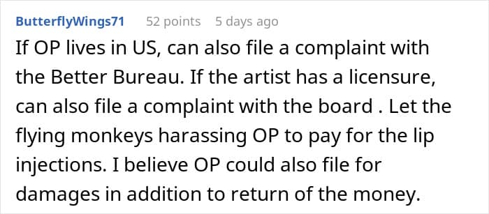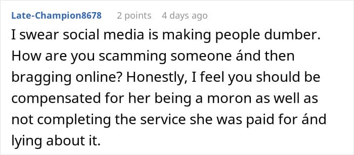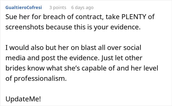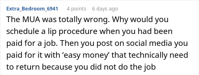 However, she couldn’t finish the job because of feeling sick. Interestingly, the bridal party later found out that the “sickness” was due to lip injections and wasn’t that bad at all. After finding out she was bragging about the “easy money” online, the bride’s sister started to consider taking legal action.