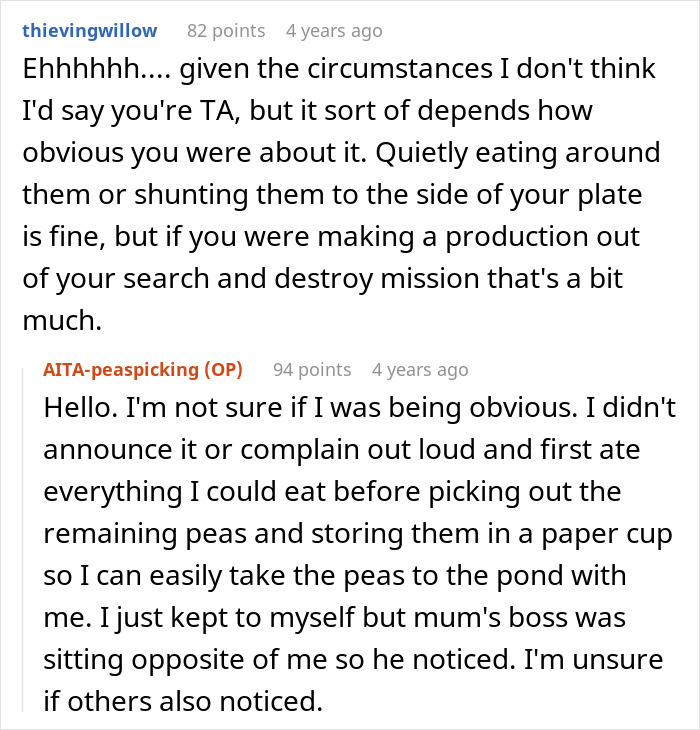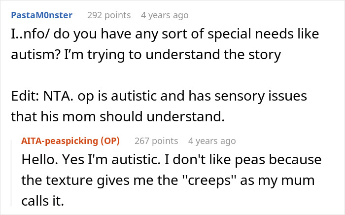 For people with autism, though, “reading the room” isn’t always straightforward. So when this Redditor joined his mother’s dinner with coworkers and was served a dish full of peas he couldn’t stand, he calmly picked them out. His mom, however, felt embarrassed watching it happen. Unsure why it caused such a reaction, he turned to the internet to ask if he was in the wrong.