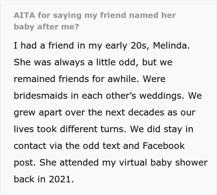 The OP believed she was the inspiration behind her friend’s baby’s name. But was her assumption correct?