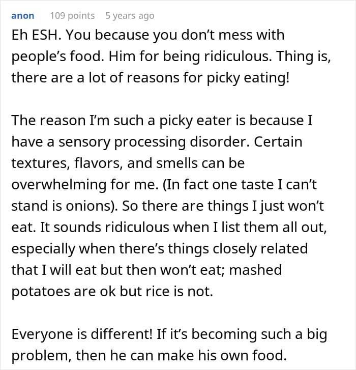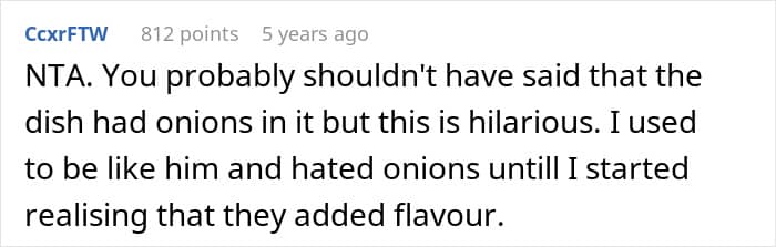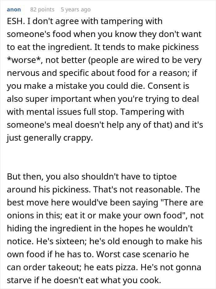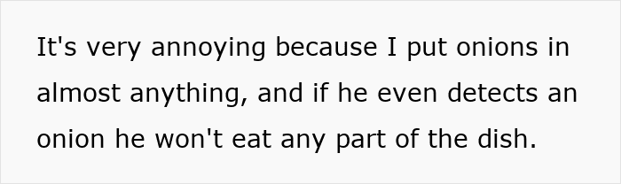 Eventually, the OP got tired of tiptoeing around her cousin’s pickiness, and she chopped onions up finely to put in his food. He didn’t realize what she had done, and he even ended up enjoying the meal, which is when the poster revealed the truth. Obviously, this made the teen very mad, and he complained to his parents about her.