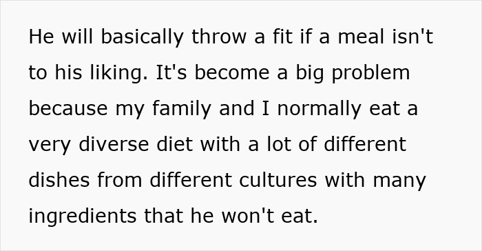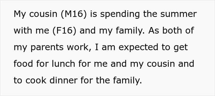 The poster explained that she had to cook for her cousin while he was staying with her family for the summer, but since he was a picky eater, it was tough to manage