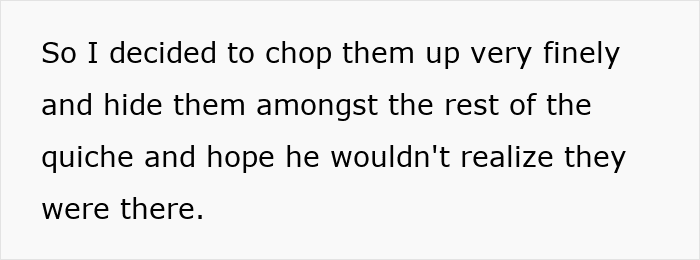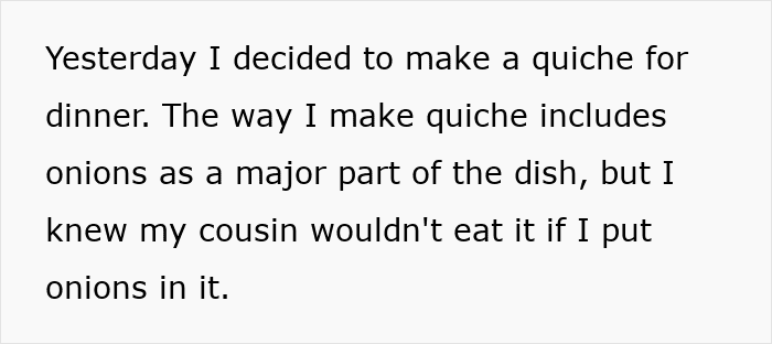 This is what happened when a teenager got annoyed by her cousin’s picky eating and secretly made him eat quiche filled with onions. When he found out what she had done, he complained to his parents, and the teen got called out for contaminating his food.